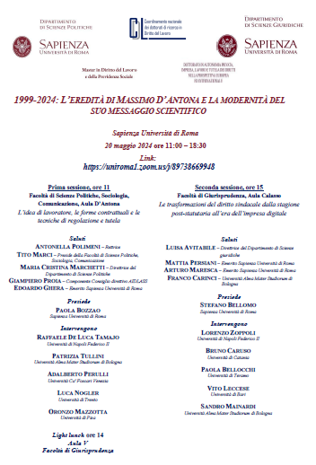 Da Lun, 20/05/2024 a Lun, 20/05/2024 Mode Hybrid File Programma756.75 KB 29/04/2024 1999-2024: l’eredità di Massimo D’Antona e la modernità del suo messaggio scientifico hybrid h. 11 Sapienza Università di Roma Link: https://uniroma1.zoom.us/j/89738669948