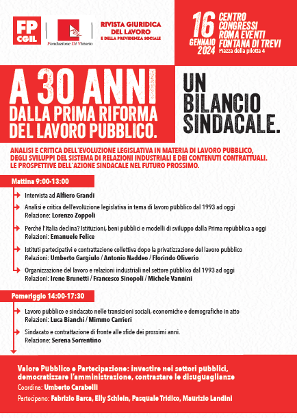 Da Mar, 16/01/2024 a Mar, 16/01/2024 Mode On-site-only File Programma673.39 KB 15/01/2024 A 30 anni dalla prima Riforma del Lavoro Pubblico. Un bilancio sindacale on-site only h. 9:00 | Piazza della pilotta 4, Roma Centro Congressi Roma Eventi Fontana di Trevi in Piazza della pilotta 4, h. 9.00-17.30