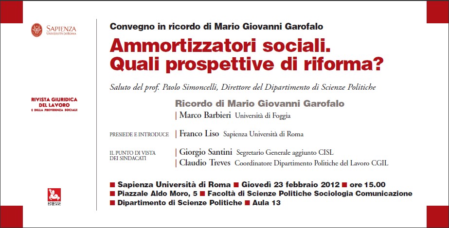 Da Gio, 23/02/2012 a Gio, 23/02/2012 Mode On-site-only 14/11/2022 Ammortizzatori sociali. Quali prospettive di riforma? Convegno in ricordo di Mario Giovanni Garofalo on-site only | Sapienza Università di Roma - Dipartimento di Scienze Politiche - Aula 13