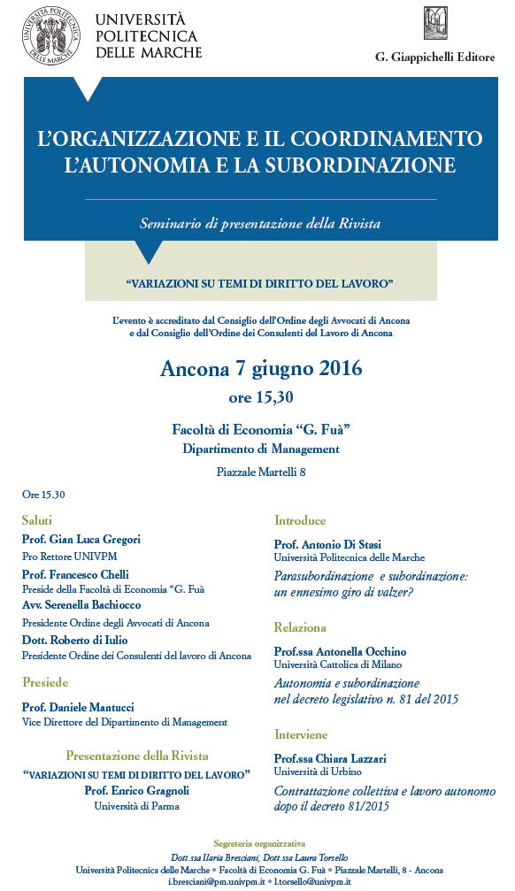 Da Mar, 07/06/2016 a Mar, 07/06/2016 Mode On-site-only 14/11/2022 ANCONA - L'organizzazione e il coordinamento | L'autonomia e la subordinazione on-site only | Piazzale Martelli, 8 | ore 15.30