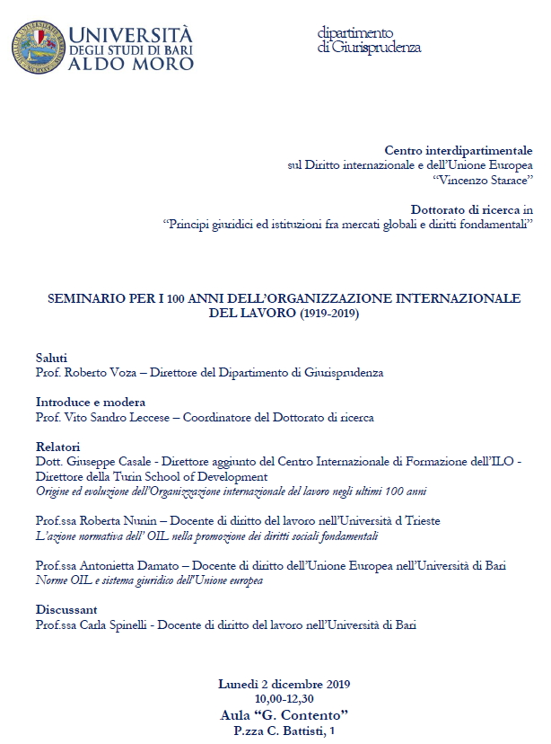 BARI - I 100 anni dell'Organizzazione Internazionale del Lavoro (1919-2019)