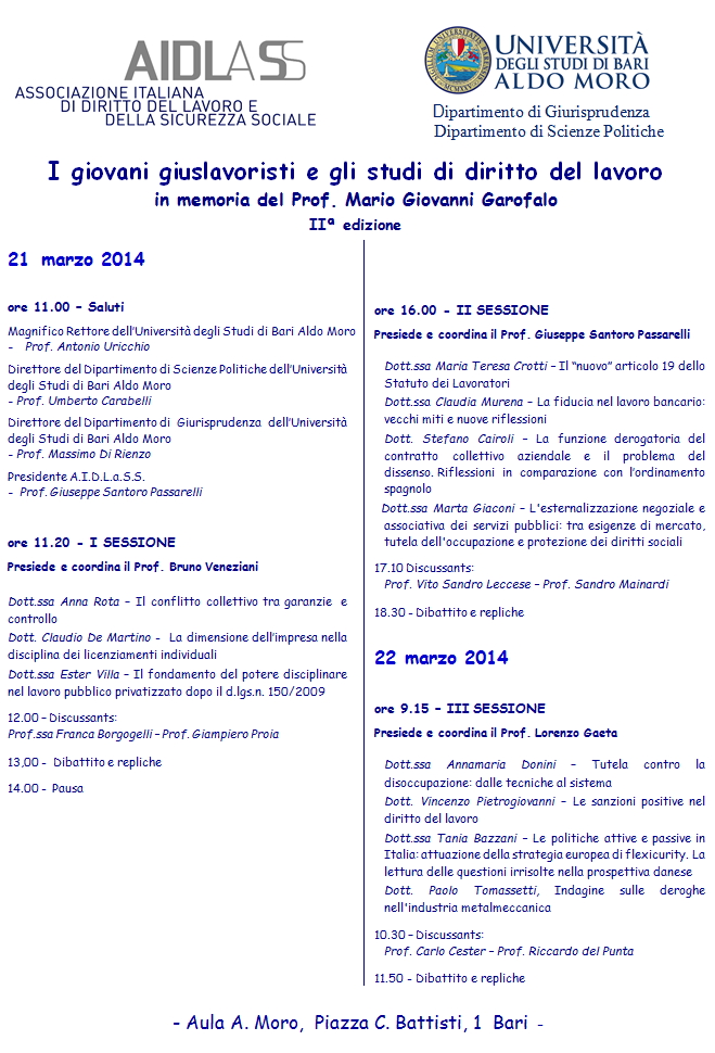Da Ven, 21/03/2014 a Ven, 21/03/2014 Mode On-site-only 14/11/2022 BARI - I giovani giuslavoristi e gli studi di diritto del lavoro. In memoria del Prof. Garofalo, IIª edizione (21-22 marzo 2014) on-site only | piazza C. Battisti 1 - 11.00