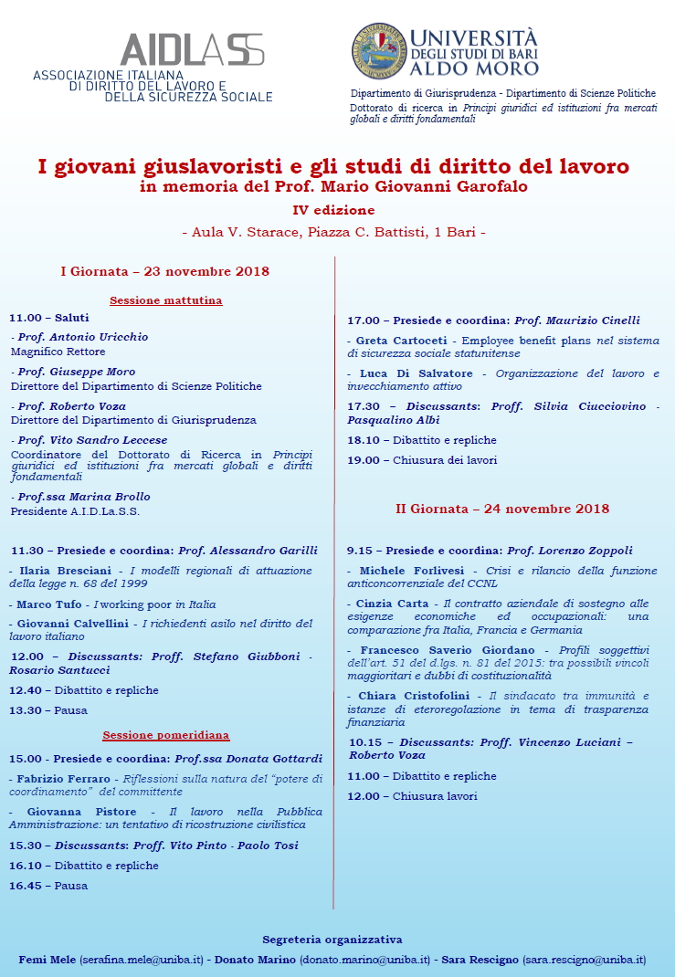 Da Ven, 23/11/2018 a Ven, 23/11/2018 Mode On-site-only 14/11/2022 BARI - I giovani giuslavoristi e gli studi di diritto del lavoro in memoria del Prof. Mario Giovanni Garofalo (23-24 novembre 2018) on-site only | Piazza C. Battisti, 1 - ore 11