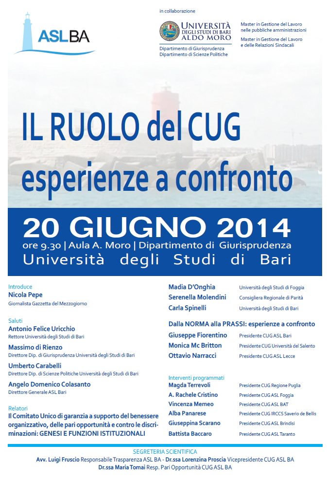 Da Ven, 20/06/2014 a Ven, 20/06/2014 Mode On-site-only 14/11/2022 BARI - Il ruolo del CUG esperienze a confronto on-site only | Dip. di Giurisprudenza - 9.30