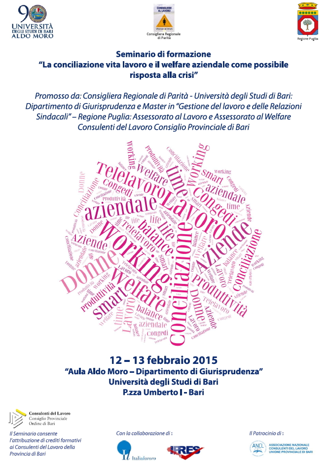 Da Gio, 12/02/2015 a Gio, 12/02/2015 Mode On-site-only 14/11/2022 BARI - La conciliazione vita lavoro e il welfare aziendale come possibile risposta alla crisi. Seminario di formazione (12-13 febbraio 2015) on-site only | P.zza Umberto I