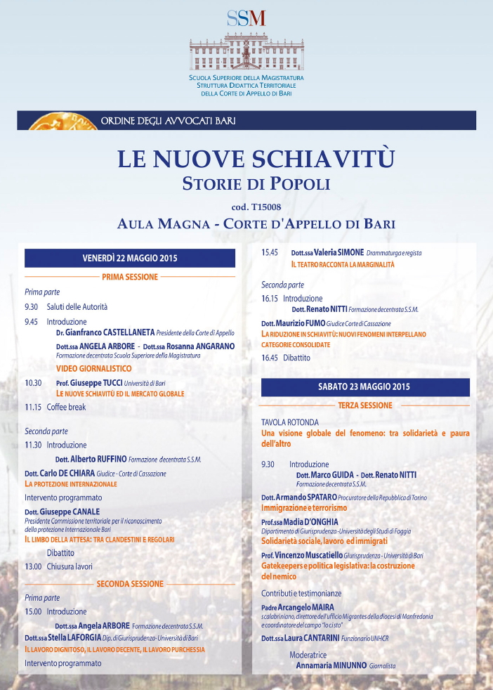 Da Ven, 22/05/2015 a Ven, 22/05/2015 Mode On-site-only 14/11/2022 BARI - Le nuove schiavitù :: Storie di popoli (22-23 maggio 2015) on-site only | Corte D'Appello - 9:30