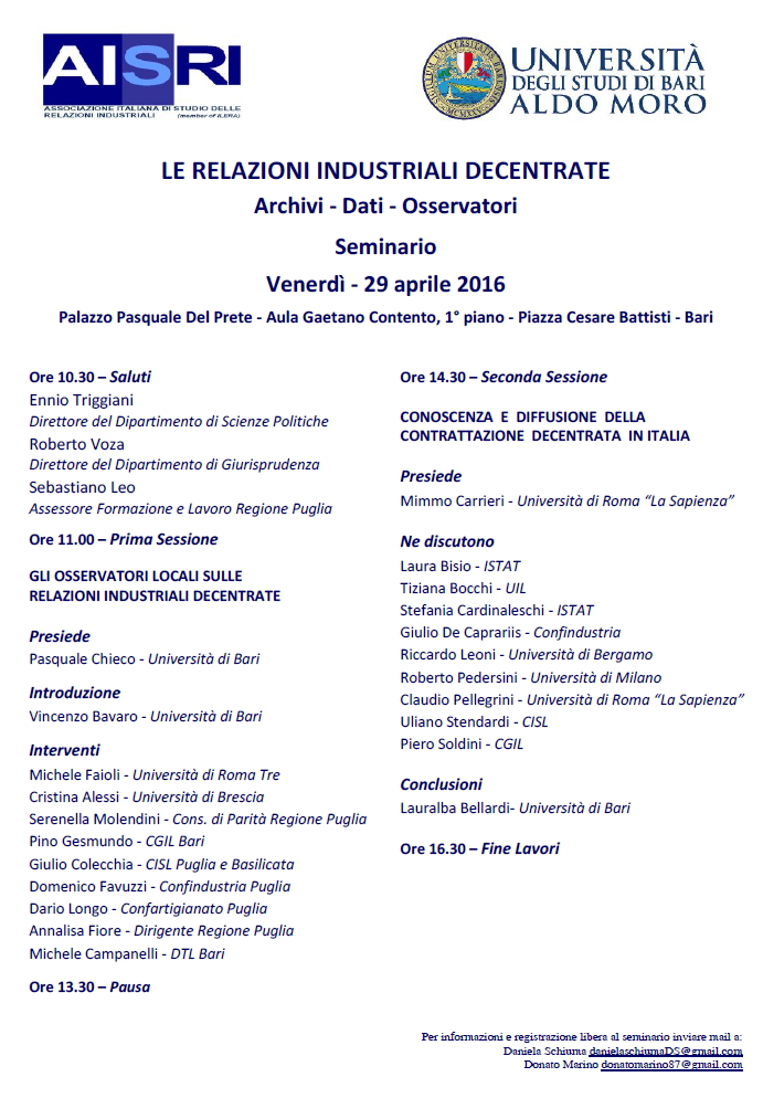 Da Ven, 29/04/2016 a Ven, 29/04/2016 Mode On-site-only 14/11/2022 BARI - Le relazioni industriali decentrate | Archivi - Dati - Osservatori on-site only | Piazza Cesare Battisti - ore 10.30
