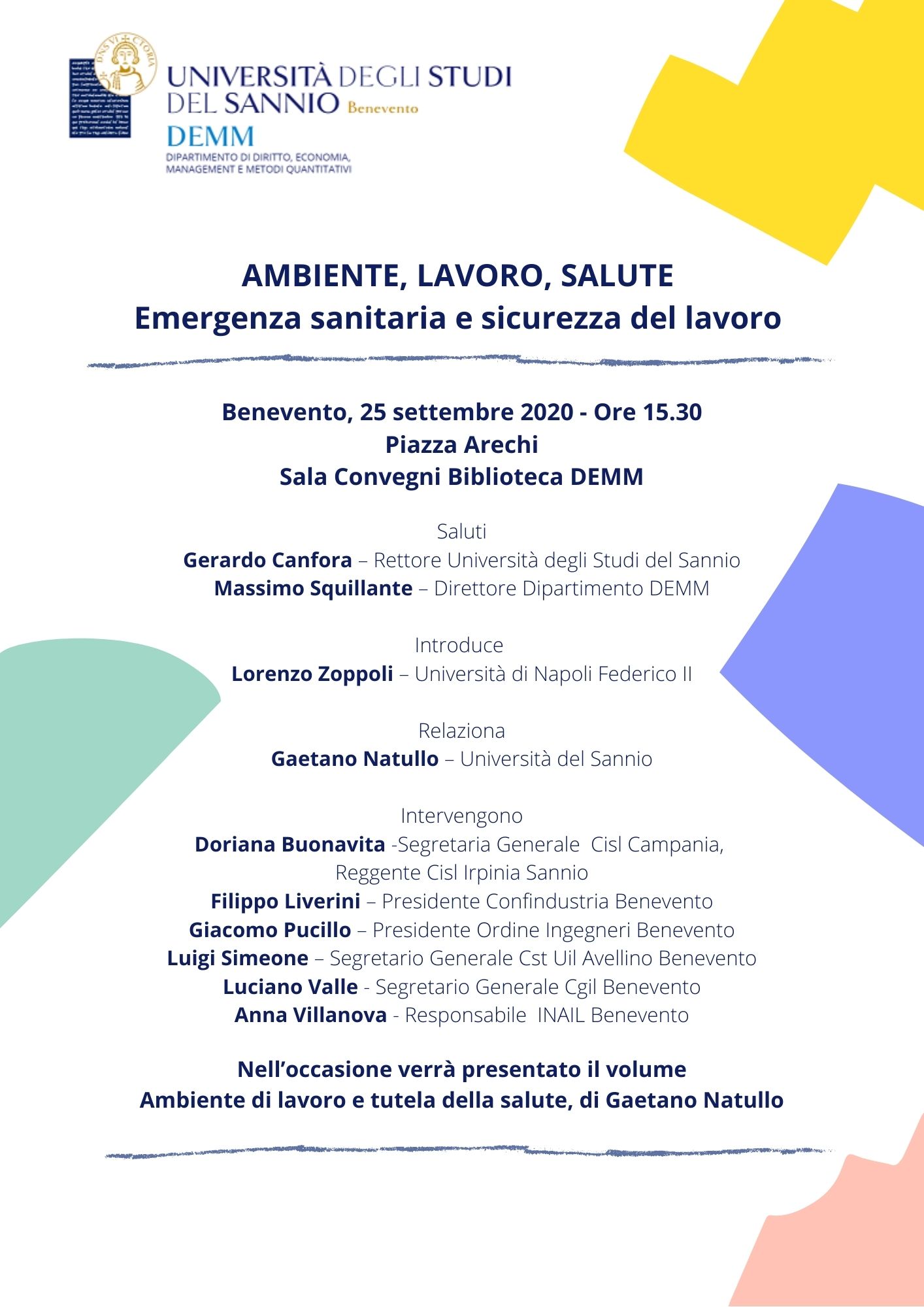 Da Ven, 25/09/2020 a Ven, 25/09/2020 Mode On-site-only 14/11/2022 BENEVENTO | Ambiente, lavoro, salute: emergenza sanitaria e sicurezza del lavoro on-site only | Sala convegni ore 15.30