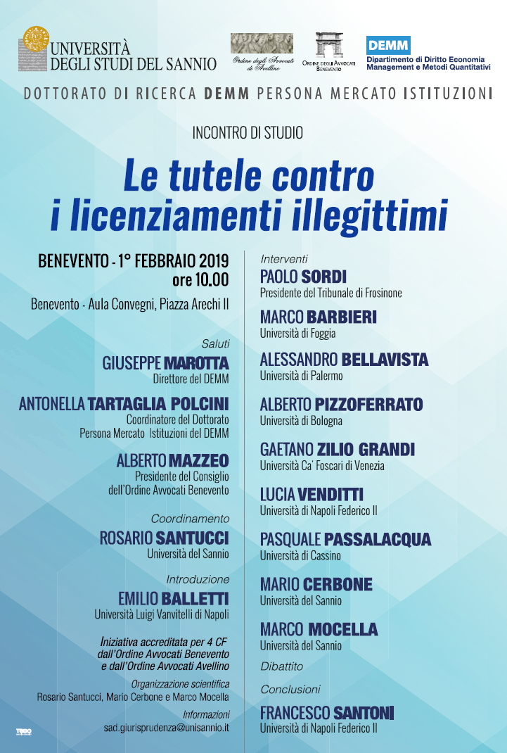 Da Ven, 01/02/2019 a Ven, 01/02/2019 Mode On-site-only 14/11/2022 BENEVENTO - Le tutele contro i licenziamenti illegittimi on-site only | Piazza Arechi II - ore 10