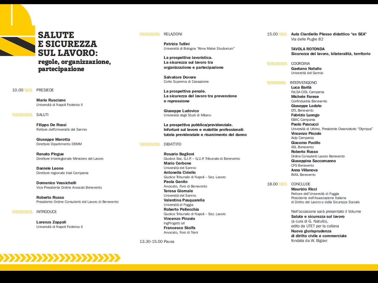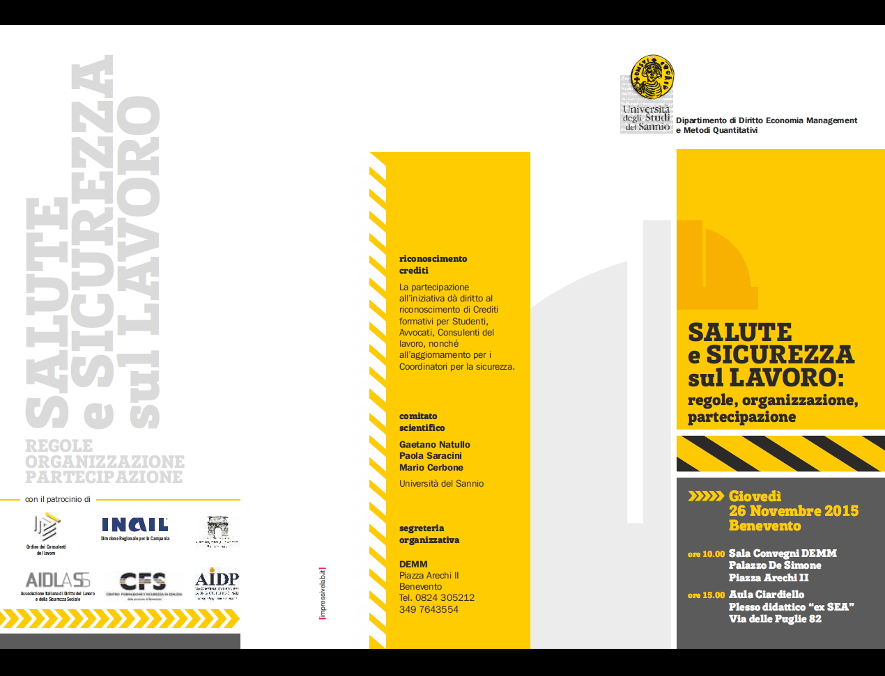 Da Gio, 26/11/2015 a Gio, 26/11/2015 Mode On-site-only 14/11/2022 BENEVENTO - Salute e sicurezza sul lavoro: regole, organizzazione, partecipazione on-site only | Piazza Arechi II - ore 10:00