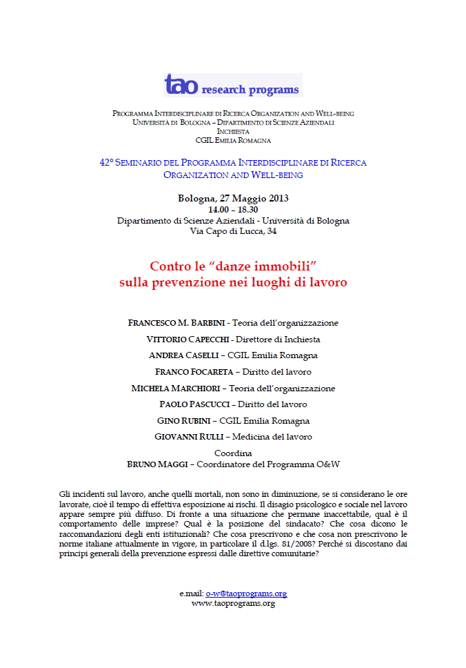 Da Lun, 27/05/2013 a Lun, 27/05/2013 Mode On-site-only 14/11/2022 BOLOGNA - Contro le “danze immobili” sulla prevenzione nei luoghi di lavoro on-site only | via Capo di Lucca, 34 - 14,00