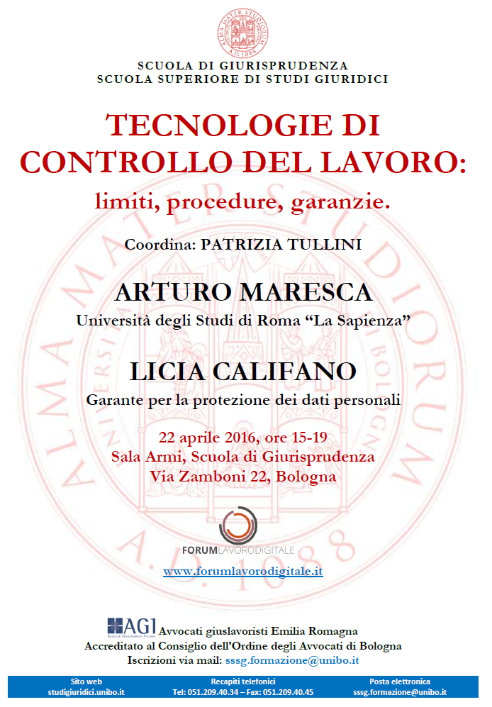 Da Ven, 22/04/2016 a Ven, 22/04/2016 Mode On-site-only 14/11/2022 BOLOGNA - Tecnologie di controllo del lavoro: limiti, procedure, garanzie on-site only | Via Zamboni, 22 - ore 15