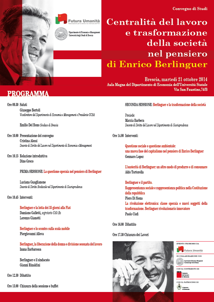 Da Mar, 21/10/2014 a Mar, 21/10/2014 Mode On-site-only 14/11/2022 BRESCIA - Centralità del lavoro e trasformazione della società nel pensiero di Enrico Berlinguer on-site only | via San Faustino,74/B - 9:30