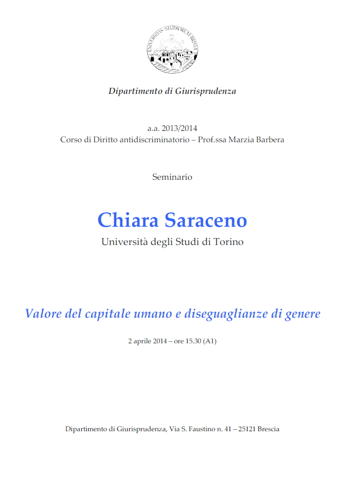 BRESCIA - Corso di Diritto antidiscriminatorio. Valore del capitale umano e diseguaglianze di genere. Seminario della prof.ssa C. Saraceno (Univ. di Torino)