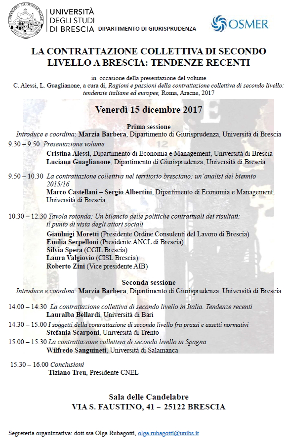 Da Ven, 15/12/2017 a Ven, 15/12/2017 Mode On-site-only 14/11/2022 BRESCIA - La contrattazione collettiva di secondo livello a Brescia: tendenze recenti on-site only | Via S. Faustino, 41 - ore 9.30