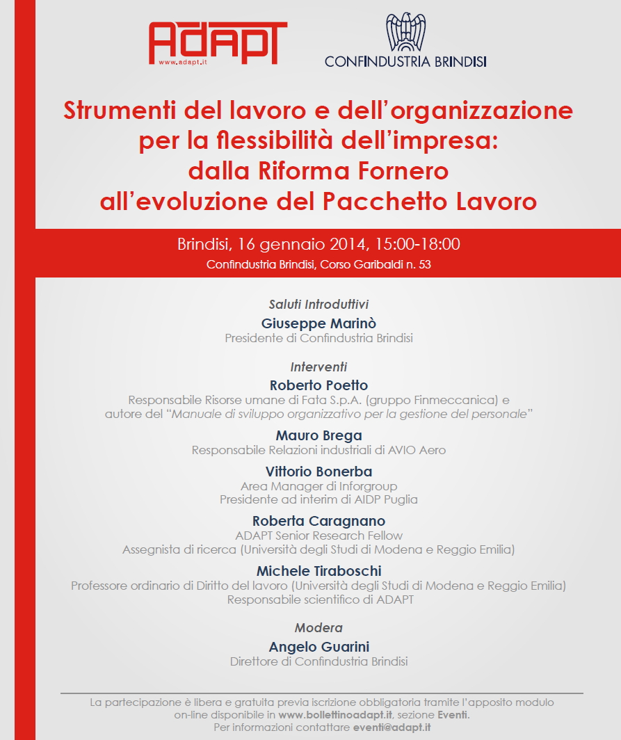 BRINDISI - Strumenti del lavoro e dell’organizzazione per la flessibilità dell’impresa: dalla Riforma Fornero all’evoluzione del Pacchetto Lavoro