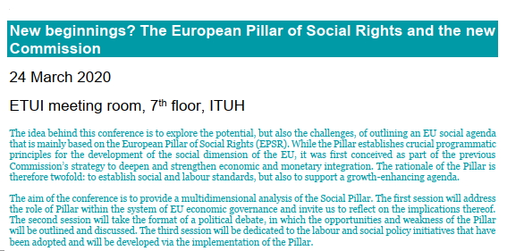 Da Mar, 24/03/2020 a Mar, 24/03/2020 Mode On-site-only 14/11/2022 BRUXELLES - New Beginnings? The European Pillar of Social Rights and the New Commission - CANCELLED on-site only | ETUI meeting room CANCELLED