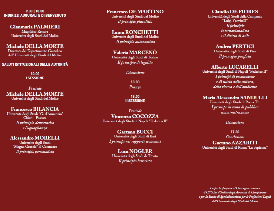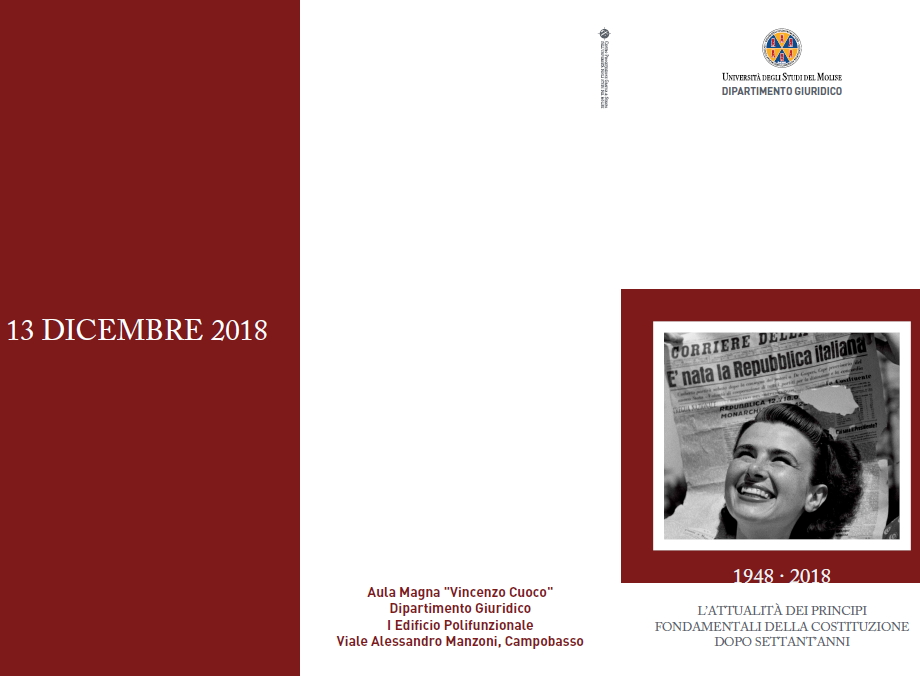 Da Gio, 13/12/2018 a Gio, 13/12/2018 Mode On-site-only 14/11/2022 CAMPOBASSO - 1948-2018. L'attualità dei principi fondamentali della Costituzione dopo settant'anni on-site only | Viale Alessandro Manzoni - ore 9.30