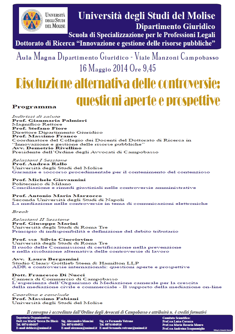 Da Ven, 16/05/2014 a Ven, 16/05/2014 Mode On-site-only 14/11/2022 CAMPOBASSO - Risoluzione alternativa delle controversie: questioni aperte e prospettive on-site only | viale Manzoni - 9.45