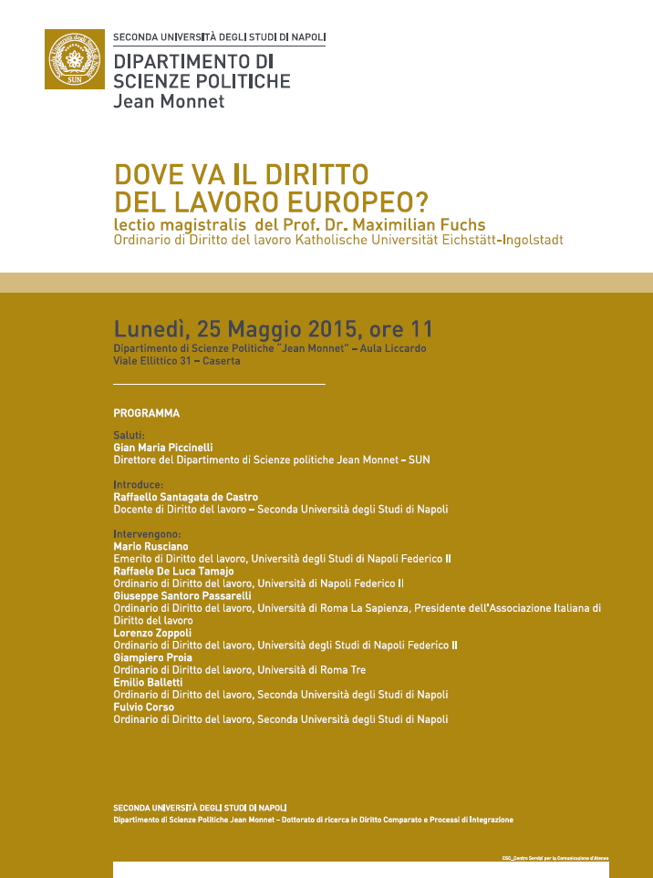 Da Lun, 25/05/2015 a Lun, 25/05/2015 Mode On-site-only 14/11/2022 CASERTA - Dove va il Diritto del lavoro europeo? on-site only | Viale Ellittico, 31 - 11:00