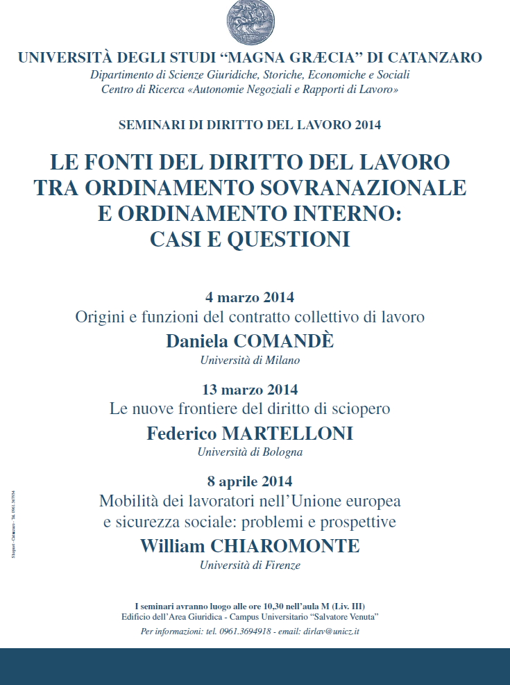 Da Mer, 19/03/2014 a Mer, 19/03/2014 Mode On-site-only 14/11/2022 CATANZARO - Seminari di Diritto del lavoro 2014 - Le nuove frontiere del diritto di sciopero. F. Martelloni, Università di Bologna on-site only | Campus Universitario “Salvatore Venuta” - 10.30