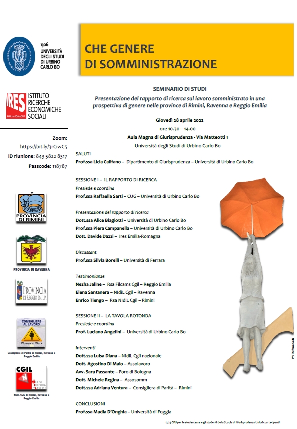 Da Gio, 28/04/2022 a Gio, 28/04/2022 Mode Hybrid File (download locandina)1.05 MB 20/04/2022 Che genere di somministrazione hybrid h. 10.30 Università degli Studi di Urbino Carlo Bo Aula Magna di Giurisprudenza Via Matteotti 1, Bologna Zoom: https://bit.ly/3rCiwC5 ID riunione: 843 5822 8317 Passcode: 118787