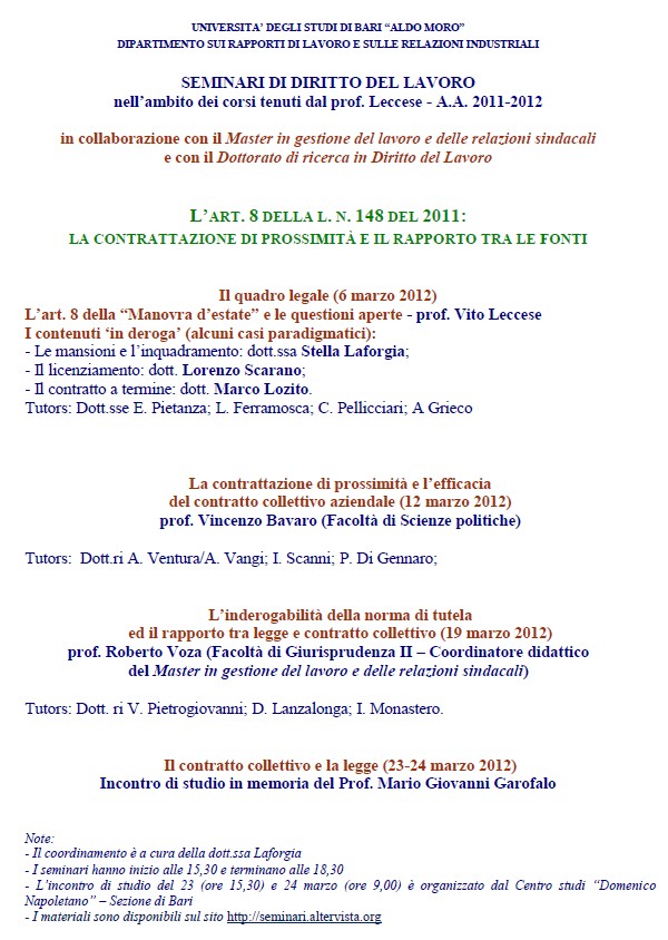 Ciclo di seminari di diritto del lavoro: L’art. 8 della l. n. 148 del 2011: la contrattazione di prossimità e il rapporto tra le fonti - Il contratto collettivo e la legge. Incontro di studio in memoria del Prof. Mario Giovanni Garofalo