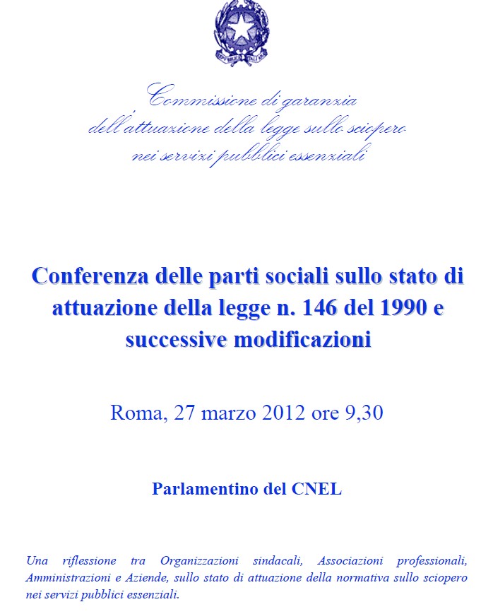 Da Mar, 27/03/2012 a Mar, 27/03/2012 Mode On-site-only 14/11/2022 Conferenza delle parti sociali sullo stato di attuazione della legge n. 146 del 1990 e successive modificazioni on-site only | Parlamentino del CNEL - ore 9.30
