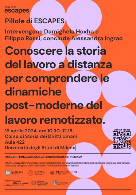 Da Ven, 19/04/2024 a Ven, 19/04/2024 Mode Hybrid File Programma96.02 KB 05/04/2024 Conoscere la storia del lavoro a distanza per comprendere le dinamiche post-moderne del lavoro remotizzato hybrid h. 10.30 Pillole di ESCAPES Università degli Studi di Milano Aula 422 Da remoto: vedi locandina