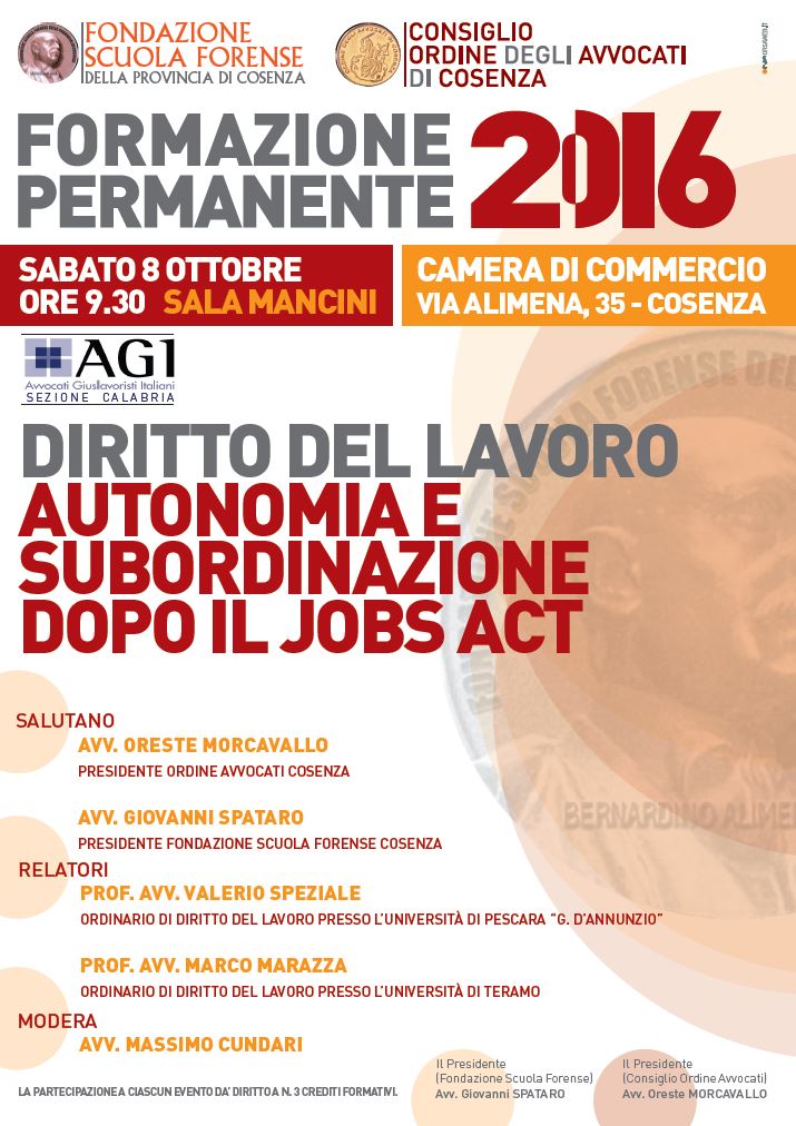 Da Sab, 08/10/2016 a Sab, 08/10/2016 Mode On-site-only 14/11/2022 COSENZA - Diritto del lavoro | Autonomia e subordinazione dopo il Jobs Act on-site only | Via Alimena, 35 - 9.30