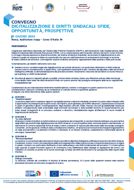 Organizzato dall’Istituto Nazionale per l’Analisi delle Politiche Pubbliche (INAPP) e dall’Osservatorio sulla Digitalizzazione delle Relazioni Industriali (ODRI) dell’Università Mercatorum, con la collaborazione dell’Università Cattolica del Sacro Cuore di Roma.