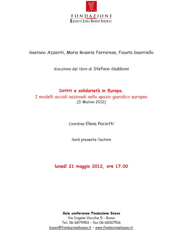Da Lun, 21/05/2012 a Lun, 21/05/2012 Mode On-site-only 14/11/2022 Diritti e solidarietà in Europa. I modelli sociali nazionali nello spazio giuridico europeo on-site only | Sala conferenze Fondazione Basso - Via Dogana Vecchia 5, Roma - 17.00