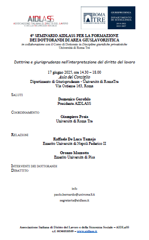 Da Mar, 17/06/2025 a Mar, 17/06/2025 Mode On-site-only File Programma206.71 KB 23/05/2025 Dottrina e giurisprudenza nell’interpretazione del diritto del lavoro on-site only h. 14:30 | Via Ostiense 163, Roma Università di RomaTre Dipartimento di Giurisprudenza - Aula del Consiglio