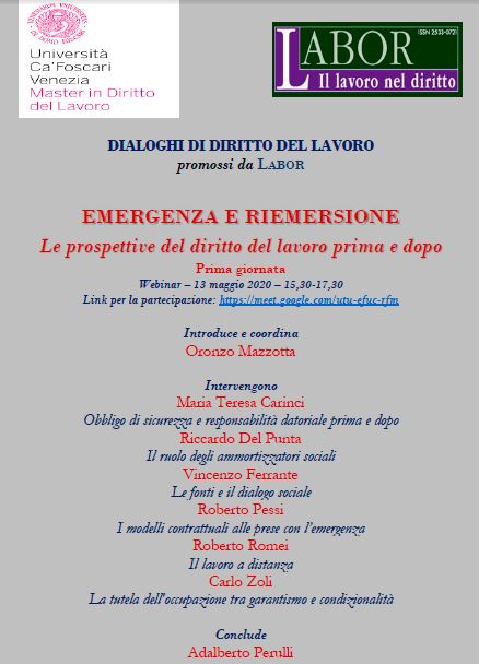 Da Mer, 13/05/2020 a Mer, 13/05/2020 Mode Online-only 14/11/2022 Emergenza e riemersione. Le prospettive del diritto del lavoro prima e dopo online only | ore 15.30 (download locandina in formato .Per partecipare: https://meet.google.com/utu-efuc-rfm