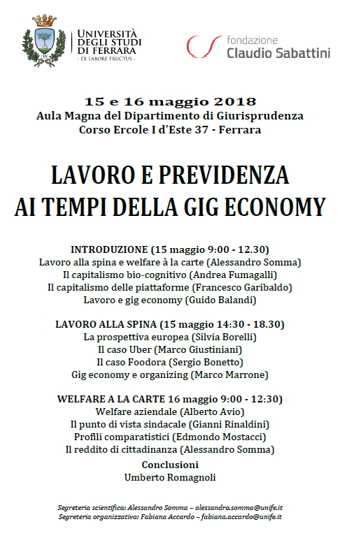 Da Mar, 15/05/2018 a Mar, 15/05/2018 Mode On-site-only 14/11/2022 FERRARA - Lavoro e previdenza ai tempi della Gig Economy (15-16 maggio 2018) on-site only | Corso Ercole I d’Este, 37 - ore 9
