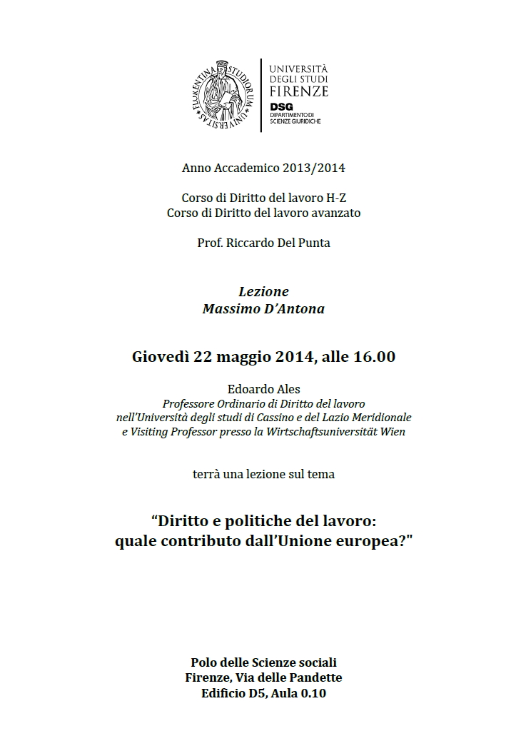 Da Gio, 22/05/2014 a Gio, 22/05/2014 Mode On-site-only 14/11/2022 FIRENZE - Diritto e politiche del lavoro: quale contributo dall’Unione europea? Lezione "Massimo D'Antona" del prof. E. Ales on-site only | via delle Pandette - 16.00