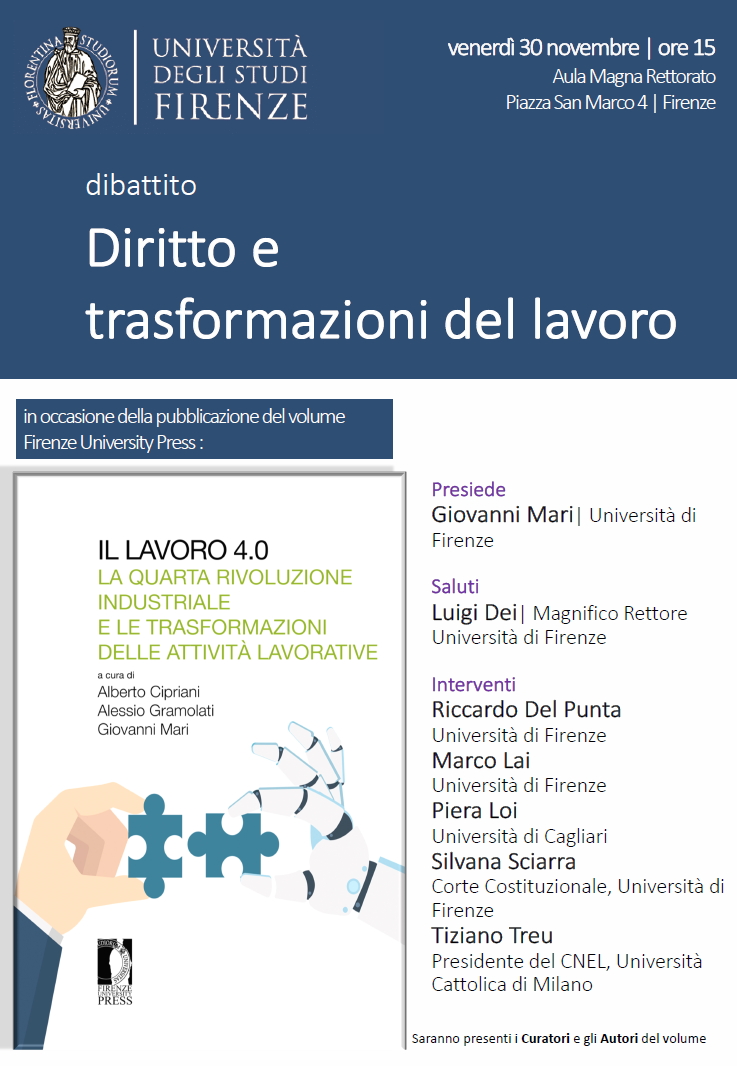 Da Ven, 30/11/2018 a Ven, 30/11/2018 Mode On-site-only 14/11/2022 FIRENZE - Diritto e trasformazione del lavoro on-site only | Piazza San Marco, 4 - ore 15