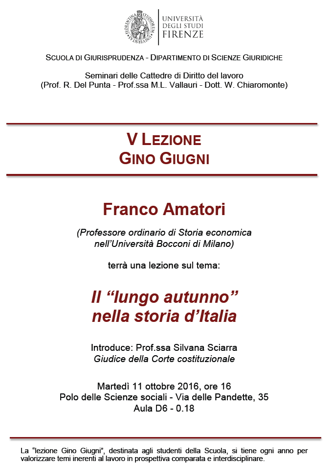 Da Mar, 11/10/2016 a Mar, 11/10/2016 Mode On-site-only 14/11/2022 FIRENZE - IV "Lezione Gino Giugni": Il “lungo autunno” nella storia d’Italia on-site only | Via delle Pandette, 35 - ore 16