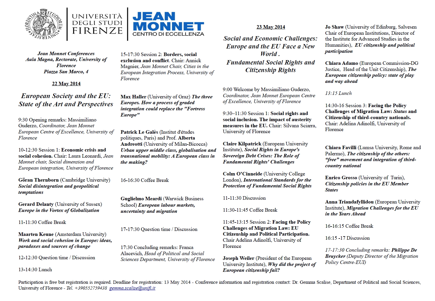 Da Ven, 23/05/2014 a Ven, 23/05/2014 Mode On-site-only 14/11/2022 FIRENZE - Social and Economic Challenge: Europe and the EU Face a New World. Fundamental Social Rights and Citizenship Rights. Jean Monnet Conference on-site only | Piazza S. Marco 4 - 9.00