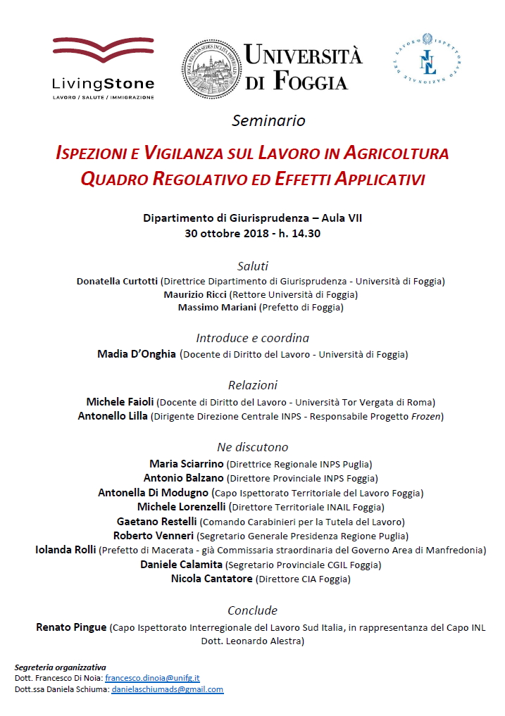 Da Mar, 30/10/2018 a Mar, 30/10/2018 Mode On-site-only 14/11/2022 FOGGIA - Ispezioni e vigilanza sul lavoro in agricoltura. Quadro regolativo ed effetti applicativi on-site only | Aula VII - ore 14.30