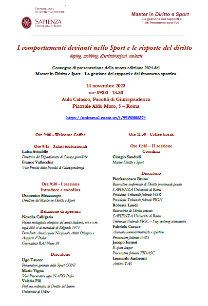 Convegno di presentazione della nuova edizione 2024 del Master in Diritto e Sport – La gestione dei rapporti e del fenomeno sportivo