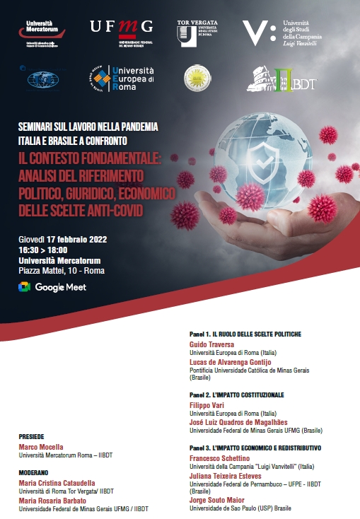 Il seminario rappresenta la prima delle tappe del progetto LAVORO NELLA PANDEMIA: ITALIA E BRASILE A CONFRONTO promosso dall'Università Federale di Minas Gerais (Brasile) in collaborazione con l'Università Mercatorum di Roma, l'Università di Roma Tor Vergata, l´Università Europea di Roma, l'Università di Cassino, l'Università della Campania “Luigi Vanvitelli, l'Istituto di Studi Giuridici Internazionali del CNR e l'Istituto Italo-Brasiliano di Diritto del Lavoro.