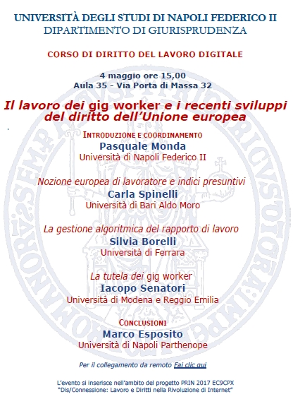 Da Mer, 04/05/2022 a Mer, 04/05/2022 Mode Hybrid File (download locandina)916.54 KB 27/04/2022 Il lavoro dei gig worker e i recenti sviluppi del diritto dell'Unione europea hybrid h. 15 Per il collegamento da remoto Fai clic qui