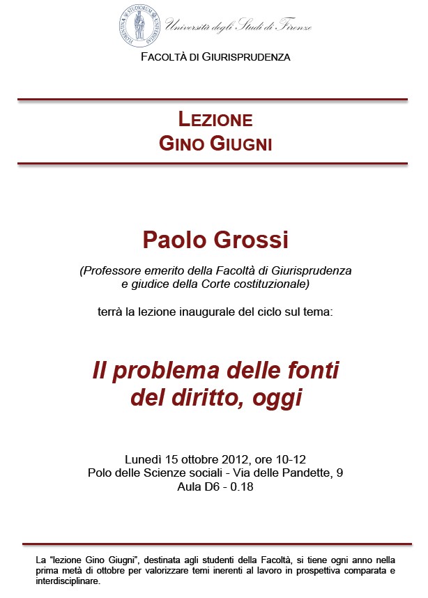 Da Lun, 15/10/2012 a Lun, 15/10/2012 Mode On-site-only 14/11/2022 Il problema delle fonti del diritto,oggi. Lezione Gino Giugni del prof. Paolo Grossi on-site only | Università di Firenze, Polo delle Scienze sociali, Via delle Pandette, 35, Firenze - 10,00