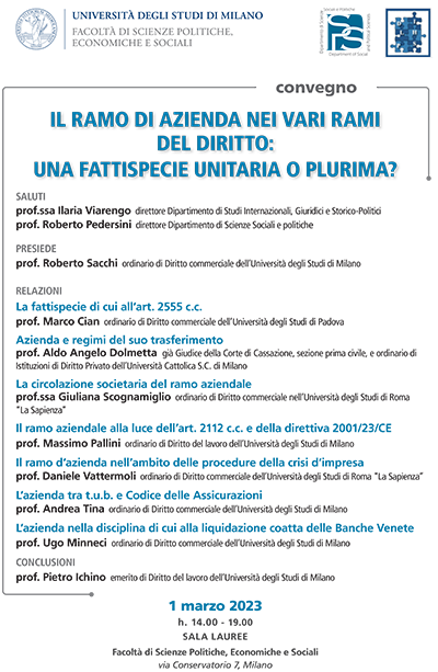 Da Mer, 01/03/2023 a Mer, 01/03/2023 Mode On-site-only File Programma214.51 KB 14/02/2023 Il ramo di azienda nei vari rami del diritto: una fattispecie unitaria o plurima? on-site only 14 | Via Conservatorio 7, Milano Università degli studi di Milano Facoltà di Scienze Politiche, Economiche e Sociali Sala Lauree