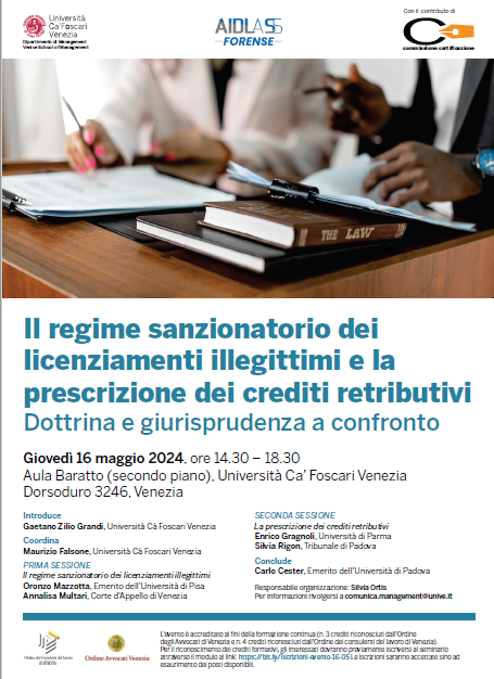 L’evento è accreditato ai fini della formazione continua (n. 3 crediti riconosciuti dall’Ordine degli Avvocati di Venezia e n. 4 crediti riconosciuti dall’Ordine dei consulenti del lavoro di Venezia).