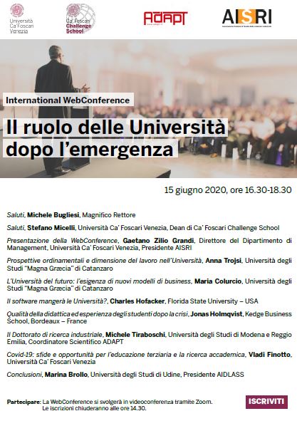 Da Lun, 15/06/2020 a Lun, 15/06/2020 Mode Online-only 14/11/2022 Il ruolo delle Università dopo l’emergenza online only | ore 16.30 (download locandina in formato .