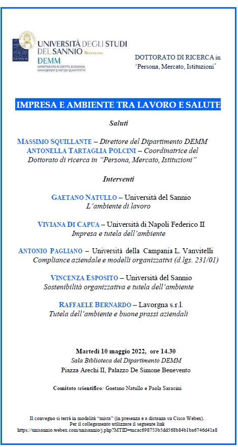 Per il collegamento utilizzare il seguente link https://unisannio.webex.com/unisannio/j.php?MTID=mcac698753b5dd568b84b1ba6746d41a8