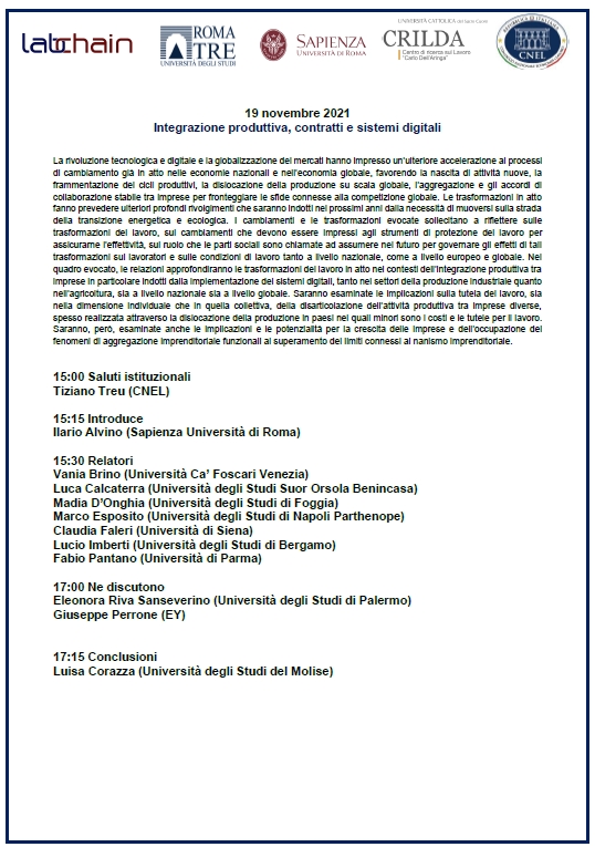 Nel quadro evocato, le relazioni approfondiranno le trasformazioni del lavoro in atto nei contesti dell’integrazione produttiva tra imprese in particolare indotti dalla implementazione dei sistemi digitali, tanto nei settori della produzione industriale quanto nell’agricoltura, sia a livello nazionale sia a livello globale. Saranno esaminate le implicazioni sulla tutela del lavoro, sia nella dimensione individuale che in quella collettiva, della disarticolazione dell’attività produttiva tra imprese diverse, spesso realizzata attraverso la dislocazione della produzione in paesi nei quali minori sono i costi e le tutele per il lavoro.