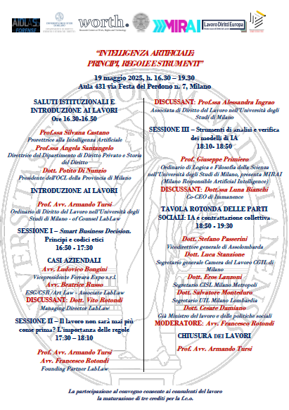 Da Lun, 19/05/2025 a Lun, 19/05/2025 Mode On-site-only File Programma1.07 MB 16/04/2025 Intelligenza artificiale: principi, regole e strumenti” on-site only h. 16:30 | Via Festa del Perdono 7, Milano Università degli Studi di Milano Dipartimento di Diritto Privato e Storia del Diritto - Aula 431